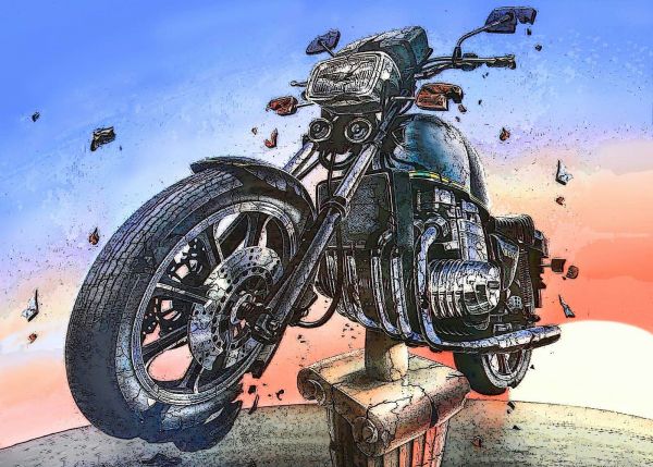 Un design potente con una motocicletta in stile retrò, rappresentata su un piedistallo contro un cielo colorato. Detriti volanti e linee dinamiche rinforzano l'azione e l'energia nell'immagine, perfetto per gli amanti delle moto e gli spiriti avventurosi.