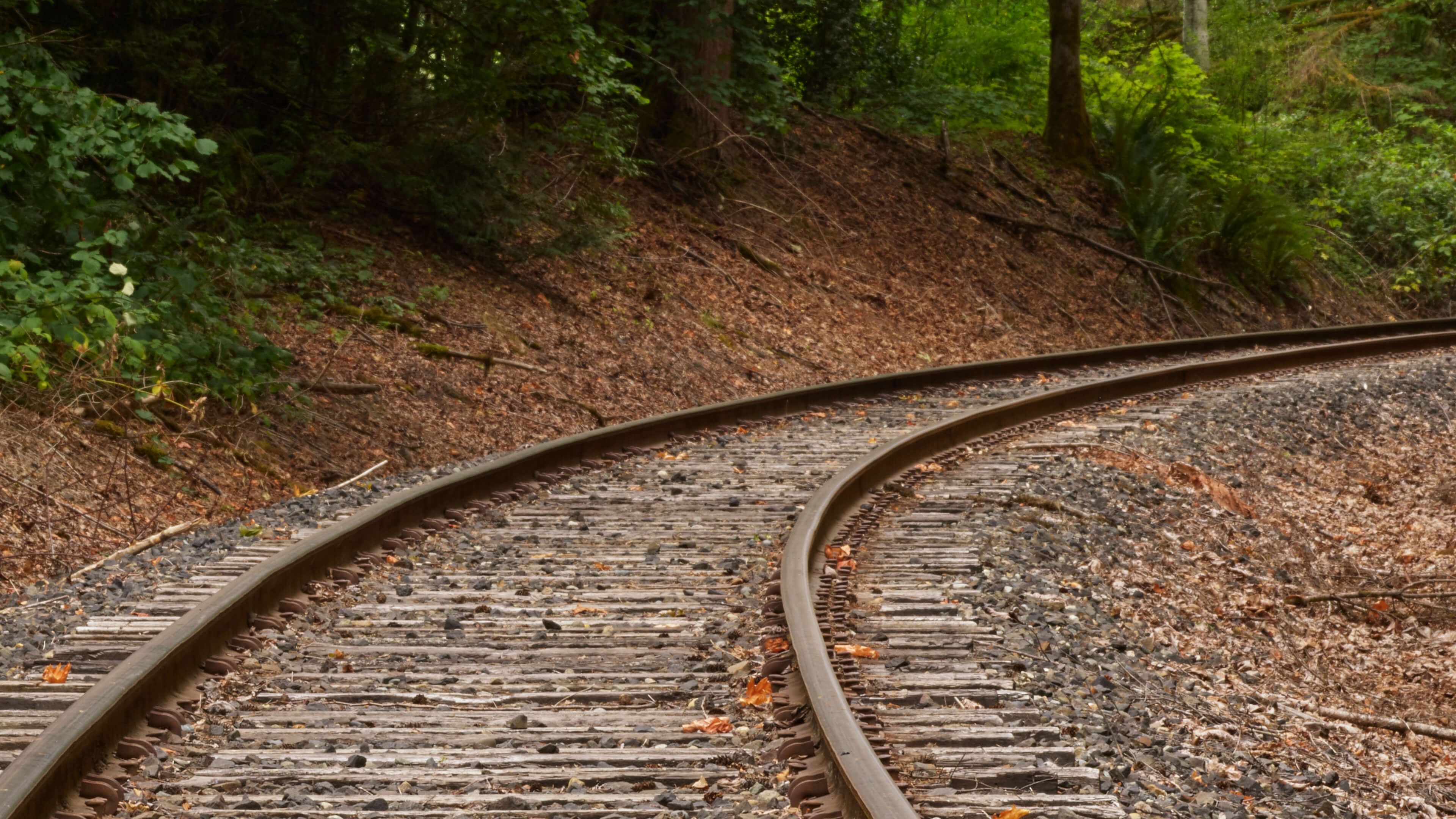 Bellissimo ritratto fotografico di un vecchio binario ferroviario attraverso la foresta