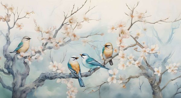 Uccelli delicati si posano con grazia tra i rami di fiori in fiore. La tavolozza di colori sottili e la composizione serena evocano la sensazione tranquilla di una mattina di primavera, dove la natura si risveglia in una melodia armoniosa di colori e forme.
