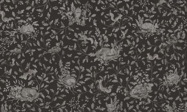 Questo design cattura l'atmosfera magica del bosco quando cala la notte. Su uno sfondo nero profondo si svolge una scena dettagliata e silenziosa: conigli che dormono tranquilli su un letto di foglie, scoiattoli nascosti tra i rami, uccellini nei loro nidi e un saggio gufo che osserva dalla sua posizione. Rami di quercia con foglie e ghiande si intrecciano nell'immagine, incorniciati da fiori, farfalle e piccoli dettagli boschivi in tonalità di grigio morbido. La limitata scala di colori monocromatica rende questo design potente e sereno. Il contrasto tra lo sfondo nero e gli animali e le piante finemente dettagliati in tonalità di grigio crea una profondità sottile ma sorprendente. Questo lo rende perfetto per un interno rustico moderno, o come accento giocoso in una stanza per bambini scura e accogliente. Gli animali dormono pacifici o vegliano tranquilli, conferendo al motivo un'atmosfera calma. Lo stile illustrativo sembra disegnato a mano, con molta attenzione ai dettagli, dando l'impressione che il tutto racconti una storia - silenziosa, delicata e confortante. La ripetizione dei rami di quercia crea ritmo, mentre la varietà di animali e piante mantiene il design vivace. Ideale per spazi in cui si desidera creare un'atmosfera accogliente e calda: una camera da letto, un angolo lettura, un angolo giochi o persino uno spazio creativo. Abbinare questo design a grigi caldi, verdi profondi, accenti di legno e texture morbide come lana o velluto per un insieme ricco e invitante. Splendido anche abbinato ad accessori blu notte o color rame per un'atmosfera stratificata extra.