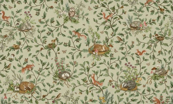 Questo incantevole design porta in vita un magico paesaggio boschivo, dove conigli, scoiattoli, gufi e uccelli canori si nascondono tra frondose querce e morbide fioriture. Lo sfondo è una calma tonalità di verde-grigio, che fa risaltare splendidamente i colori caldi degli animali e il verde intenso delle foglie. In tutto il motivo si possono scoprire piccole storie: un coniglio addormentato su un letto di muschio, un gufo su un ramo fiorito, un nido di piccoli uccelli e scoiattoli giocosi che si arrampicano allegramente tra ghiande e farfalle.