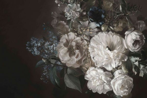 Questo sontuoso design dà vita alla bellezza classica di un bouquet di fiori. Le raffinate rose, peonie e fiori in morbidi toni crema e terra contrastano splendidamente con lo sfondo scuro, mentre sottili accenti di blu e verde aggiungono una dimensione extra all'insieme. Le dettagliate pennellate e le texture realistiche creano un'atmosfera che ricorda la pittura del periodo barocco, in cui i fiori venivano immortalati come simboli di transitorietà ed eleganza. Questo design si adatta perfettamente a un interno classico, vintage o lussuoso. In combinazione con toni di legno scuro, velluto e accenti in ottone si crea un'atmosfera calda e romantica. In un interno moderno, questo design può invece costituire una dichiarazione artistica, soprattutto quando è abbinato a linee pulite e mobili minimalisti. Anche in un contesto botanico o eclectic chic, questo design aggiunge un senso di raffinatezza. Grazie ai colori ricchi e ai profondi contrasti, questo design è ideale per spazi suggestivi come una elegante sala da pranzo, un soggiorno stiloso o una camera da letto chic. Anche in un hotel, ristorante o lounge può creare un aspetto lussuoso e classico, conferendo immediatamente alla stanza un'allure senza tempo. Per esaltare la grandiosità di questo design, possono essere aggiunti accessori in oro, argento antico o legno scuro. L'illuminazione d'atmosfera con toni caldi fa sì che i fiori risaltino ulteriormente e lo sfondo drammatico venga accentuato. Questo design è un'ode senza tempo ai classici dipinti floreali e porta un senso di lusso ed eleganza in ogni spazio.