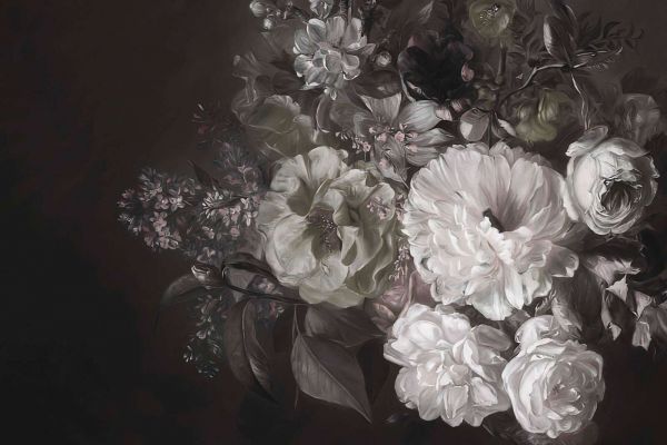 Questo classico bouquet di fiori emana un lusso sobrio e mette in risalto la bellezza di composizioni floreali raffinate. Le splendide rose e peonie in delicate tonalità di verde e morbidi toni di rosa polvere contrastano elegantemente con uno sfondo scuro, quasi misterioso. Le dettagliate pennellate e le sottili transizioni di colore creano un effetto pittorico che ricorda i maestri antichi del periodo barocco e romantico. Questo design si adatta perfettamente a un interno classico o vintage, arricchendo lo spazio con un senso di storia ed eleganza. Combinato con mobili in velluto, accenti in legno antico e dettagli dorati morbidi, si crea un insieme caldo e lussureggiante. In un interno moderno, può fungere da dichiarazione artistica, dove lo sfondo scuro e le sottili tonalità di colore formano un contrasto emozionante con linee pulite ed elementi minimalisti. Le tonalità profonde e morbide rendono questo design particolarmente adatto per spazi intimi come una elegante sala da pranzo, una camera da letto chic o un accogliente lounge. In un boutique hotel o in una boutique esclusiva, può conferire un aspetto unico e lussuoso, mentre in un soggiorno crea un'atmosfera raffinata e artistica. Per rafforzare l'aspetto romantico e vintage, si possono aggiungere accessori in oro antico, ottone o legno scuro. L'illuminazione calda, come la luce delle candele o lampade da parete soffuse, darà vita ancora di più ai colori ricchi e metterà in risalto lo sfondo drammatico. Questo design è un'ode senza tempo alla bellezza dei fiori e porta una combinazione unica di nostalgia, lusso e raffinatezza in ogni spazio.
