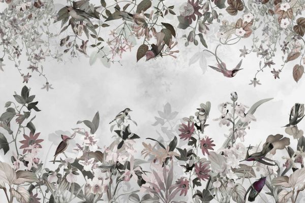 Este hermoso diseño combina elementos naturales como flores, elegantes pájaros y un fondo suave para crear una atmósfera serena y encantadora. Se crea un conjunto armonioso con una paleta de tonos pastel y naturales, como el verde suave, el rosa claro y los sutiles tonos tierra. Los detalles de pájaros revoloteando y motivos botánicos añaden una sensación dinámica pero discreta. Ideal para un salón o dormitorio donde se desee tranquilidad y elegancia, o para darle un aspecto único a un espacio de oficina. Combine este diseño con muebles y accesorios neutros, como detalles en madera o telas de lino, para acentuar los elementos naturales. Esta composición atemporal es adecuada tanto para interiores modernos como clásicos.