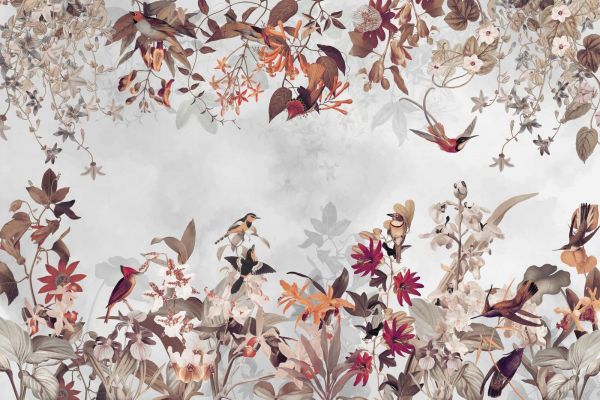 Este hermoso diseño combina elementos naturales como flores, elegantes pájaros y un fondo suave para crear una atmósfera serena y encantadora. Se crea un conjunto armonioso con una paleta de tonos pastel y naturales, como el verde suave, el rosa claro y los sutiles tonos tierra. Los detalles de pájaros revoloteando y motivos botánicos añaden una sensación dinámica pero discreta. Ideal para un salón o dormitorio donde se desee tranquilidad y elegancia, o para darle un aspecto único a un espacio de oficina. Combine este diseño con muebles y accesorios neutros, como detalles en madera o telas de lino, para acentuar los elementos naturales. Esta composición atemporal es adecuada tanto para interiores modernos como clásicos.