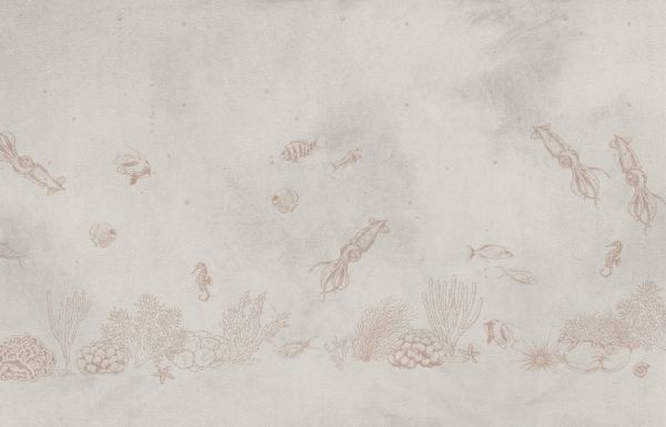 Calamari nel mare. Guardate, seduti nella vostra stanza, i calamari sul fondo dell'oceano. Carta da parati trendy e alla moda per le camere dei bambini