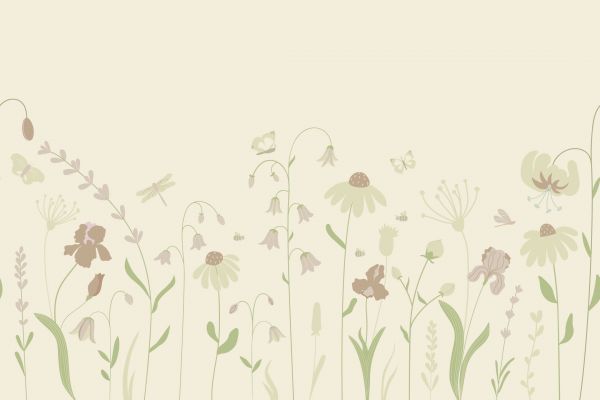 Campo di fiori alti con fiori e insetti diversi, come farfalle e api, in diverse tonalità di beige e rosa antico Colore: Beige e rosa antico