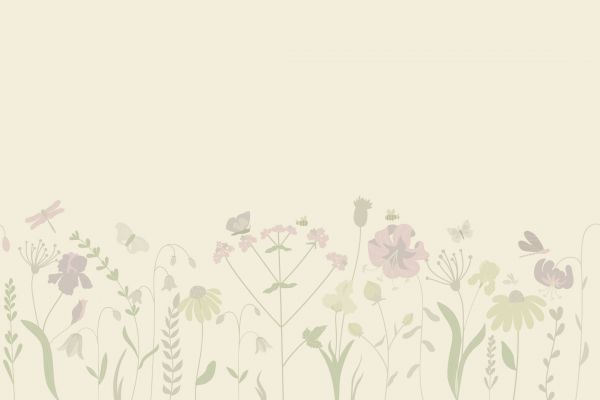 Campo di fiori con diversi fiori e vari insetti come farfalle e api. Colore: Beige con rosa antico