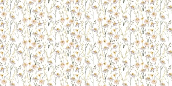 Questo design cattura l'essenza di un prato fiorito estivo, con graziose margherite e sottili accenti botanici in tonalità di rosa tenue e oro caldo. La flora ripetitiva crea un ritmo rilassante, generando un'atmosfera di relax e bellezza naturale.