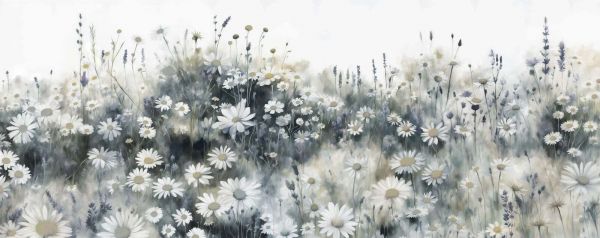 Un vivace prato fiorito con brillanti tonalità di verde, in cui le margherite e la lavanda sembrano appena risvegliarsi dalla rugiada mattutina. I colori freschi e le morbide pennellate creano un'atmosfera ottimista e naturale che ravviva ogni stanza.