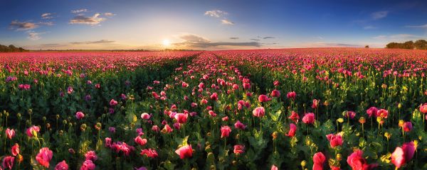 Una foto panoramica di un paesaggio pieno di bei papaveri viola con il sole in lontananza.