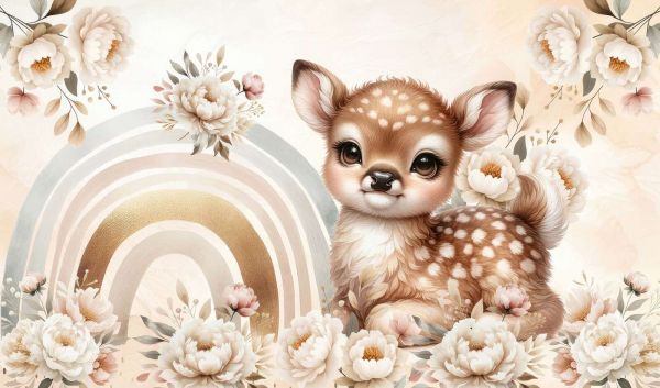 Un grazioso cerbiatto si trova tra fiori morbidi, circondato da un'elegante arcobaleno con accenti dorati. Le calde tonalità beige e crema conferiscono al design un aspetto sognante e sereno, perfetto per un'atmosfera accogliente e fiabesca.