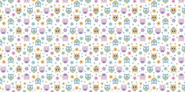 Carta da parati con un motivo di simpatici gufi, fiori e puntini in vari colori pastello