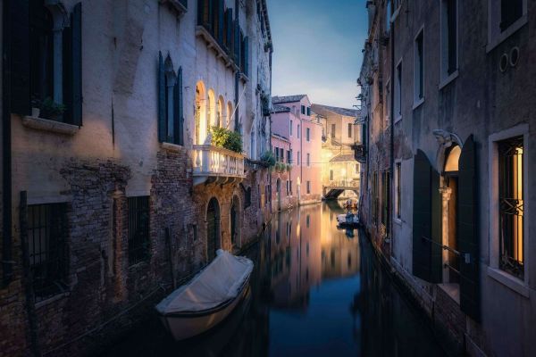 Un design sognante che cattura la romanticità di Venezia nelle ore serali. La luce soffusa proveniente dalle finestre e dai balconi aperti si riflette sull'acqua, mentre le facciate storiche emanano un fascino senza tempo. La miscela di tonalità calde e fredde crea un'atmosfera serena e suggestiva.