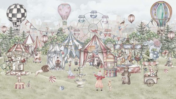 L'illustrazione è composta da morbidi colori pastello come rosa chiaro, azzurro baby, bianco panna e rosso chiaro, arricchiti da tonalità verdi naturali e accenti in legno. Questi colori rendono il design perfetto per un'atmosfera giocosa e leggera nelle camere dei bambini o negli spazi gioco. Si combina splendidamente con mobili bianchi o in legno, bandierine decorative, festoni di stoffa e giocattoli retro.