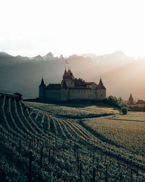 Castello circondato da vigneti e cime montuose che si protendono verso il cielo. I raggi del sole provenienti lateralmente creano un'atmosfera di luce magica.