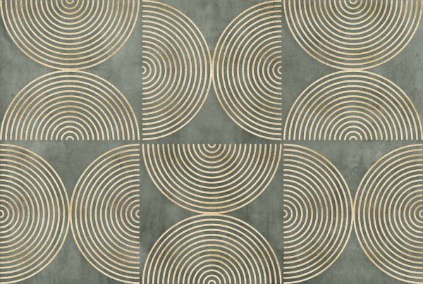 Un potente motivo grafico di semicircoli color oro su uno sfondo verde grigiastro intenso. La ripetizione di sottili linee concentriche crea un aspetto lussuoso con un carattere pulito e ritmico.