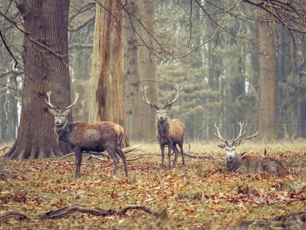 Cervi selvatici in una tranquilla riserva naturale. Tutti e tre i cervi guardano nella stessa direzione.