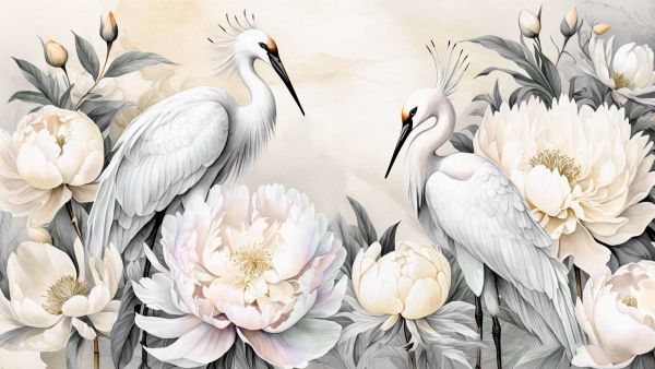 Due eleganti gru che passeggiano tra peonie in una palette di taupe, verde grigio e morbidi toni terrosi. Le sottili gradazioni di colore e i contorni finemente disegnati creano un aspetto sobrio, ma al contempo raffinato.