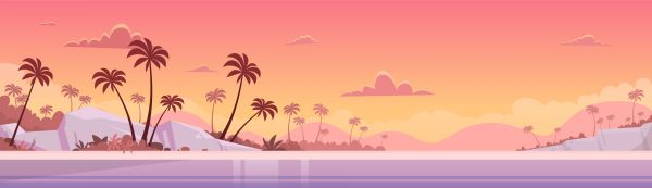 Vista della spiaggia disegnata con diversi colori e palme.