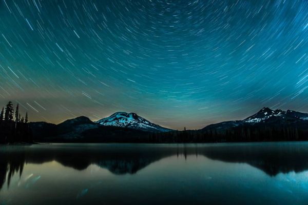 Carta da parati con un cielo stellato scuro con effetto intorno e una montagna innevata. In primo piano c'è un lago visibile in cui l'insieme riflette