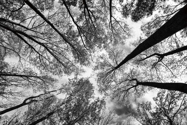 Un potente gioco di linee di alberi alti che si estendono dal centro verso il cielo, rappresentato in un contrasto ricco di bianco e nero. Un effetto di profondità visiva che suscita calma e ammirazione.