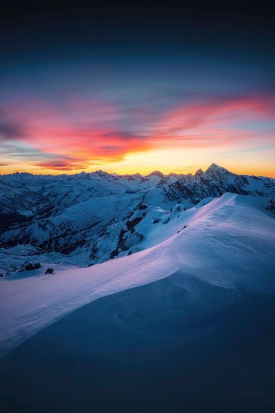 Cime montuose innevate catturano la prima luce del giorno, mentre nuvole rosa e arancioni si diffondono come pennellate nel cielo. Un paesaggio sereno e gelido con una calda luminescenza all'orizzonte.