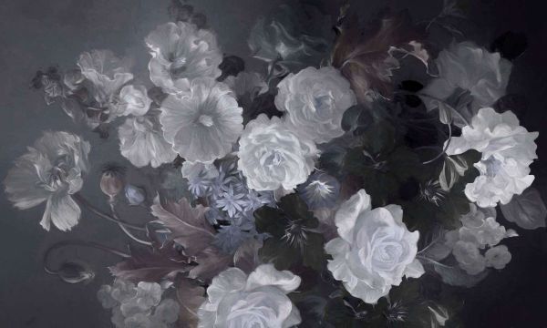 Questo incantevole design floreale combina l'eleganza classica con un aspetto mistico e senza tempo. Le delicate rose, papaveri e altri fiori in tonalità fredde di bianco, grigio e blu contrastano splendidamente con lo sfondo profondo e scuro, creando un effetto drammatico e suggestivo. Le morbide pennellate e le sottili sfumature di colore conferiscono all'insieme un'atmosfera pittorica e quasi onirica, ispirata ai maestri antichi della pittura. Grazie ai colori sobri ed eleganti, questo design si adatta perfettamente a un interno classico, moderno o romantico. La combinazione di tonalità scure e fiori delicatamente illuminati crea un aspetto lussuoso e raffinato, che si sposa bene con materiali come velluto, marmo e legni scuri. In un interno minimalista, questo design può essere un punto focale elegante, mentre in un contesto vintage si abbina splendidamente a dettagli antichi e accenti metallici caldi. L'aspetto sereno e misterioso rende questo design particolarmente adatto per spazi come la camera da letto, il soggiorno o una sala da pranzo chic. Lo sfondo scuro aggiunge profondità e calore, mentre i leggeri accenti floreali offrono un contrasto raffinato che conferisce alla stanza un'atmosfera classica ed elegante. Per un'immagine totale armoniosa, si possono aggiungere accessori come candelabri d'argento, vasi di vetro e tonalità blu profonde e morbide nei tessuti. Questo design floreale senza tempo e raffinato porta in vita la bellezza dei classici nature morte e forma una base elegante e suggestiva per un interno sofisticato e accogliente.