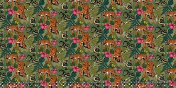 Un motivo di cobra e tigri con fiori, foglie e farfalle su uno sfondo verde.