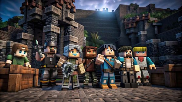 Un gruppo audace di personaggi pixel si riunisce in una robusta fortezza di pietra. Circondati da architettura medievale, i personaggi emanano collaborazione e avventura. Il cielo scuro e gli accenti vivaci creano un'atmosfera intensa piena di azione e mistero.