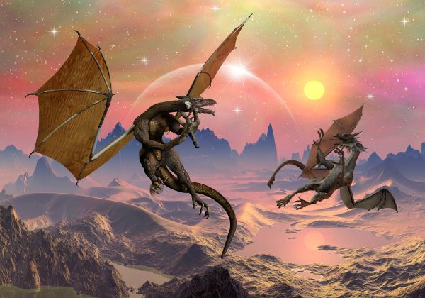 Combattere i draghi in un paesaggio fantasy. Combinate questa carta da parati fotografica nella stanza dei vostri bambini per ottenere una vera e propria stanza della fantasia.