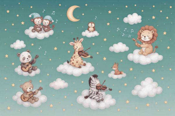 In questa scena fiabesca, animali musicali suonano insieme in una notte piena di stelle e nuvole. Un panda, un orso e una zebra suonano dolcemente le loro chitarre e violini, mentre una giraffa e un leone riempiono il cielo con suoni sognanti di strumenti ad arco e arpa. Due scimmiette con cuffie da notte sono sedute vicine l'una all'altra sulla loro nuvola, godendosi lo spettacolo celeste. Una volpe e un piccolo gufo guardano, circondati da un cielo stellato in verde sbiadito e una gentile mezzaluna.