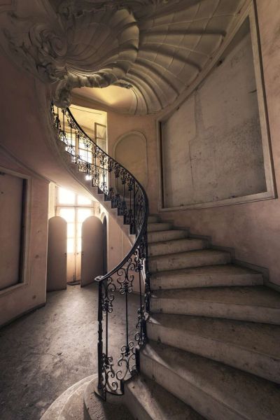 La splendida scala di una bellissima ed enorme villa in Italia. La conchiglia in cima alle scale ha dato il nome all'edificio nella scena Urbex.