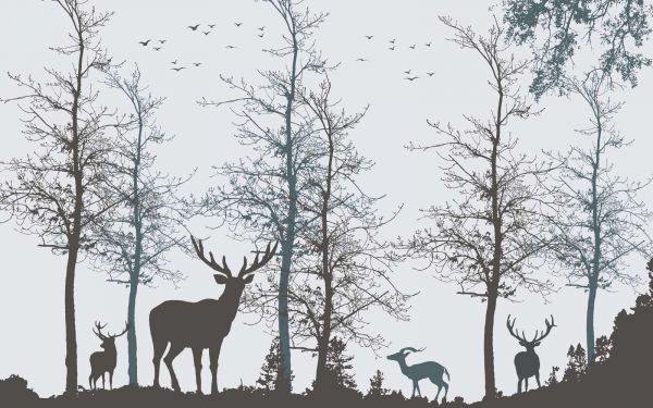Contro un cielo sereno, le sagome di cervi e alberi rivelano una tranquilla giornata invernale. I rami spogli e l'atteggiamento calmo degli animali danno un senso di coesistenza pacifica, come una scena silenziosa catturata in un momento di tranquillità senza tempo.