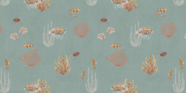 Un motivo subacqueo rilassante con colorati reef corallini, pesci tropicali, cavallucci marini e tartarughe. Lo sfondo marrone chiaro e le illustrazioni dettagliate creano un'atmosfera marittima serena, perfetta per aggiungere un accento rilassante ed esotico a qualsiasi ambiente.