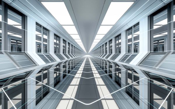Un corridoio futuristico in 3D in un edificio per uffici.