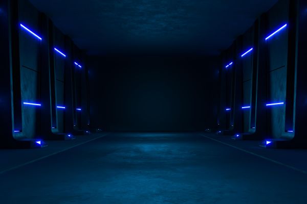 Un corridoio abbandonato con illuminazione a LED. Con questa carta da parati fotografica nella stanza, è come se ci si trovasse in questa stanza abbandonata.