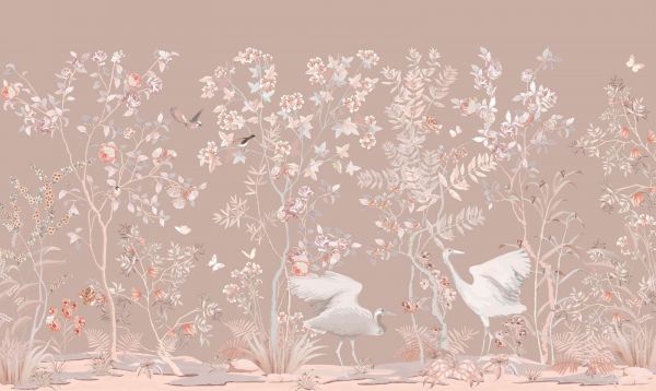 Un design raffinato con eleganti cicogne e delicate fiori in morbidi colori pastello. Lo sfondo beige rilassante mette in risalto l'eleganza della natura, mentre farfalle e uccelli danno vita all'insieme.