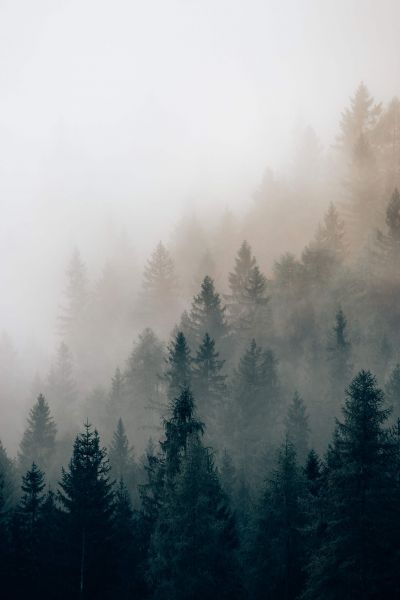 Cortina d'Ampezzo durante la nebbia. La nebbia sospesa sugli alberi rende la foresta misteriosa.