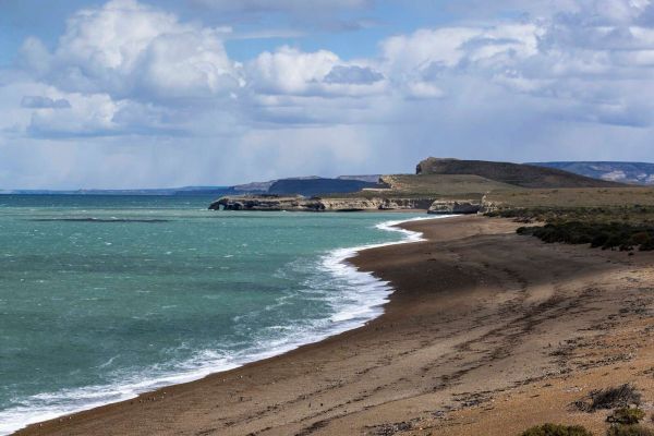 Un impressionante paesaggio costiero con spiagge di sabbia scura, scogliere ripide e un mare blu-verde selvaggio sotto un cielo nuvoloso.