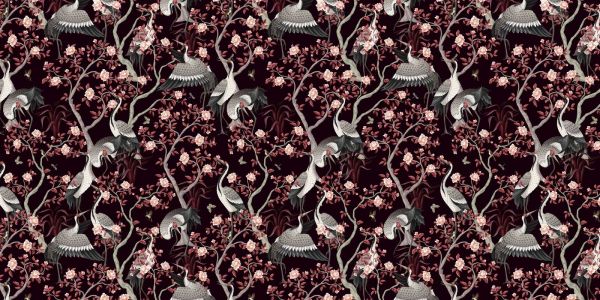 Contro uno sfondo scuro e ricco si svolge un'elegante danza di gru in mezzo a fiori in fiore. La postura graziosa degli uccelli e il delicato rosa dei fiori formano un motivo classico e senza tempo che esprime tranquillità e movimento.