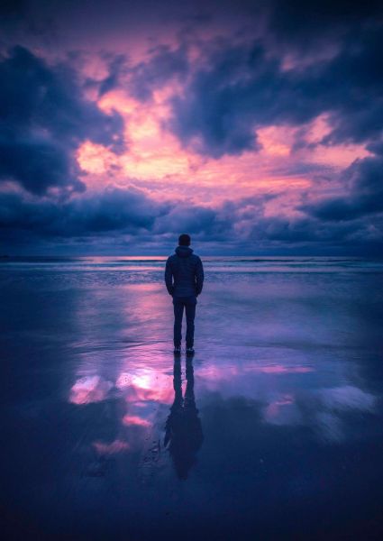 Un profilo è fermo su una spiaggia bagnata, circondato da profonde tonalità blu viola e un cielo serale drammatico e luminoso. La riflessione del cielo nell'acqua rafforza la sensazione di quiete e solitudine.