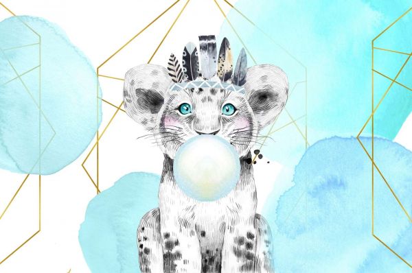 Bellissima carta da parati con un leoncino che soffia una grossa bolla di gomma.