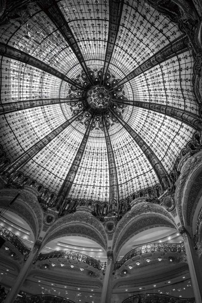 Una cupola di vetro impressionante piena di ornamenti eleganti e linee simmetriche. Il contrasto in bianco e nero sottolinea la grandiosità e la raffinatezza architettonica dell'edificio.