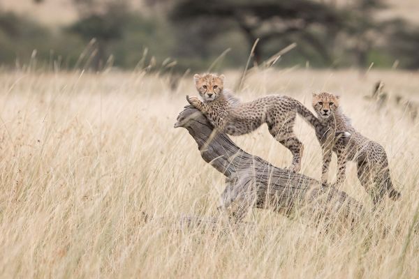 Curiosi cuccioli di ghepardo appollaiati su un tronco d'albero che guardano attraverso la zona.