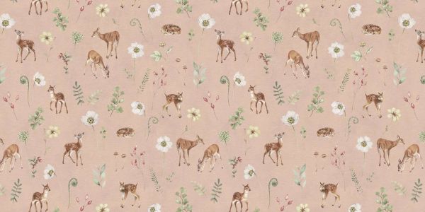 Un delicato motivo boschivo con eleganti cerbiatti e fiori sottili in tenui colori pastello. Questo design giocoso emana un'atmosfera dolce e naturale, perfetta per aggiungere un accento morbido e affascinante a qualsiasi ambiente.