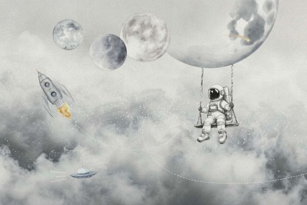 Questa illustrazione mostra una scena vivace con navicelle spaziali che tracciano traiettorie aggraziate attorno a pianeti disegnati in dettaglio, tutti immersi in una luce soffusa e nebbiosa. È un mix giocoso di fantasia e realismo, catturato in una palette di colori tenui.