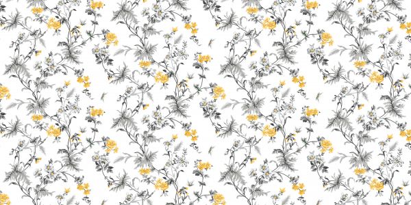 Un armonioso gioco di tonalità di grigio con vivaci accenti gialli caratterizza questo design, in cui i fiori primaverili sembrano danzare elegantemente su uno sfondo morbido e bianco.