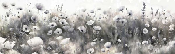 Un giardino acquatico nuvoloso in cui i papaveri e i fiori selvatici si delineano in toni pastello grigiati e tranquilli. Lo sfondo nebbioso crea un'atmosfera intima, quasi misteriosa, come se i fiori stessero appena emergendo dalla rugiada mattutina.