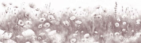 Un campo di fiori rosa pallido in cui papaveri, ranuncoli e margherite selvatiche si fondono giocosamente. Lo sfondo pastello con delicate pennellate conferisce alla composizione un aspetto romantico e da sogno.